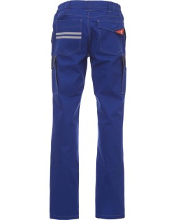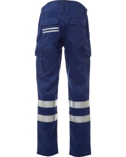 656 KčKalhoty z bavlněného strečového kepru, s reflexními páskami kat. 1, poutky a elastickým páskem v pase, zapínání na zip a knoflík. Dvě přední kapsy klasického střihu, pravá. -